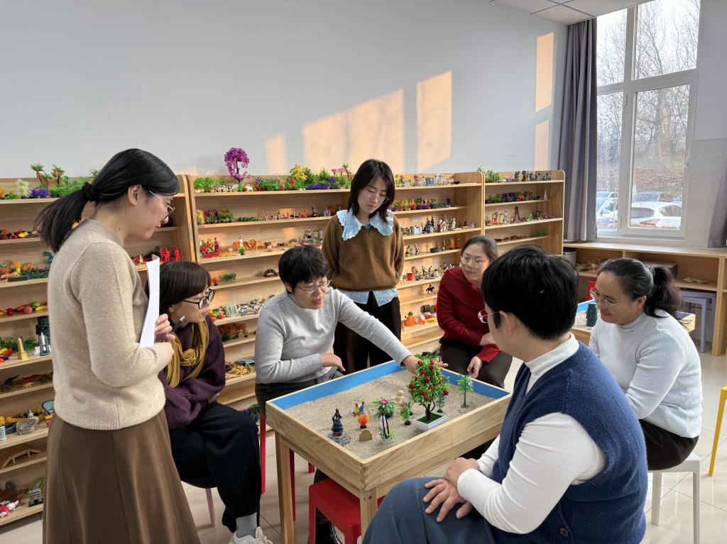 活动伊始,在主持人的引导下,老师们纷纷伸出双手触摸细沙。指尖与沙粒的轻柔触碰,让大家逐渐卸下工作的疲惫,在与沙的联结中放松身心、沉淀思绪。随后,老师们移步玩具架,精心挑选契合自身心境的玩具,有条不紊地在沙盘中进行作品创作。创作过程中,大家全神贯注、沉浸其中,时而驻足思索,时而俯身摆放,用一个个小摆件勾勒心中的图景,将内心的感受与期许融入作品之中。