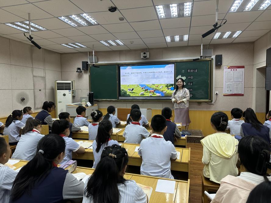 跟着课文去旅行,伊鑫老师执教的《牧场之国》一课,巧妙融合AI技术赋能小学语文课堂。课堂伊始,伊老师通过AI智能生成“荷兰之旅邀请函”,带领学生化身“文化策展人”,开启荷兰之旅。课上层层深入,引导学生聚焦牛群吃草、骏马飞驰、群畜活动、牧场夜景等画面,通过多样朗读、圈画批注、交流分享等方式,感受荷兰的自由、安闲与宁静,学习作者“动静结合”和“以动衬静”的写作密码。最后,利用“AI语音合成”技术介绍写作背景,让学生进一步感受牧场之美,理解作者对和平生活的珍视。