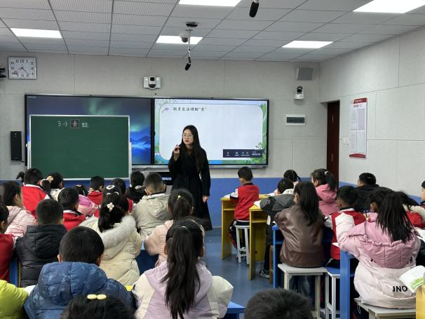 首先,现在附小双师锻炼的年轻教师周影执教了一年级下册识字课《小青蛙》。整堂课的设计思路清晰,从读到写,环节完结。周老师在授课过程中,注重让学生在丰富的语言实践中识记生字。综合运用了多种识字方法,如“猜谜语”“加一加”“找规律”等,并巧妙设计了多种趣味识字活动,如“幸运大转盘”“看图找异同”等,有效激发了学生的识字兴趣。课堂最后周老师还结合课下注释,为学生补充了字族识字法,将汉字的构字规律与偏旁表意巧妙融合,让字族识字法在孩子们心中生根发芽,让学生充分感受到了汉字的趣味与魅力。