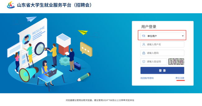 进入山东省大学生就业服务平台后,选择“单位用户”,点击右下角“单位注册”,进行注册;已注册过的用人单位可直接输入用户名、密码点击“登录”。