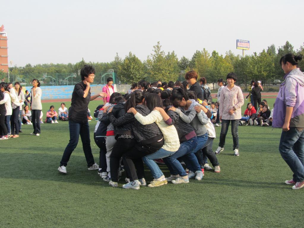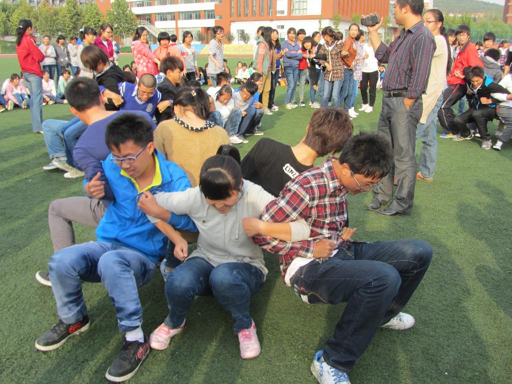2012年10月11日下午3点半,人文科学系团总支组织全体2012级新生在校足球场上开展了一场别开生面的游戏竞赛。本次竞赛主要围绕团队意识,增强班级同学之间的凝聚力为中心,以班为单位进行了“坐地起身”和“人椅”的拓展。通过本次活动,一方面调动了2012级新同学入学后参与活动的积极性;另一方面,是同学们认识到团结的力量,互相支持、互相信任,是整个班级凝聚在一起。