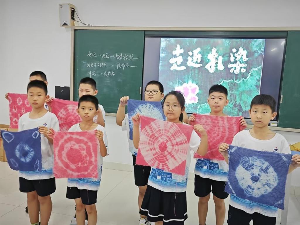 带领孩子们前往社会实践基地,体验扎染、烧饼制作等传统技艺。扎染课堂上,孩子们在老师的悉心指导下,亲自挑选布料、设计图案,然后进行扎结、染色等步骤,创作出独一无二的艺术作品。每一件艺术作品都凝聚着孩子们的创意和心血,也让他们领略到了齐文化的深厚底蕴。制作周村烧饼的过程中,孩子们不仅了解了这一传统美食的历史渊源与制作工艺,还亲手揉面、擀饼、烘烤。当金黄酥脆、香气四溢的烧饼出炉时,孩子们迫不及待地品尝起来。这不仅满足了他们的味蕾,更让他们感受到了地道的齐地风味。