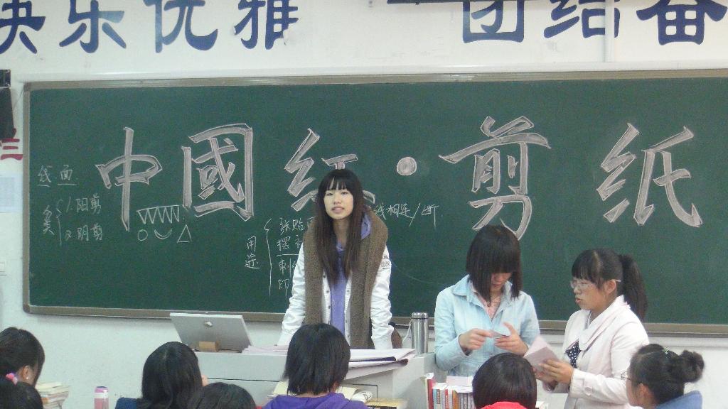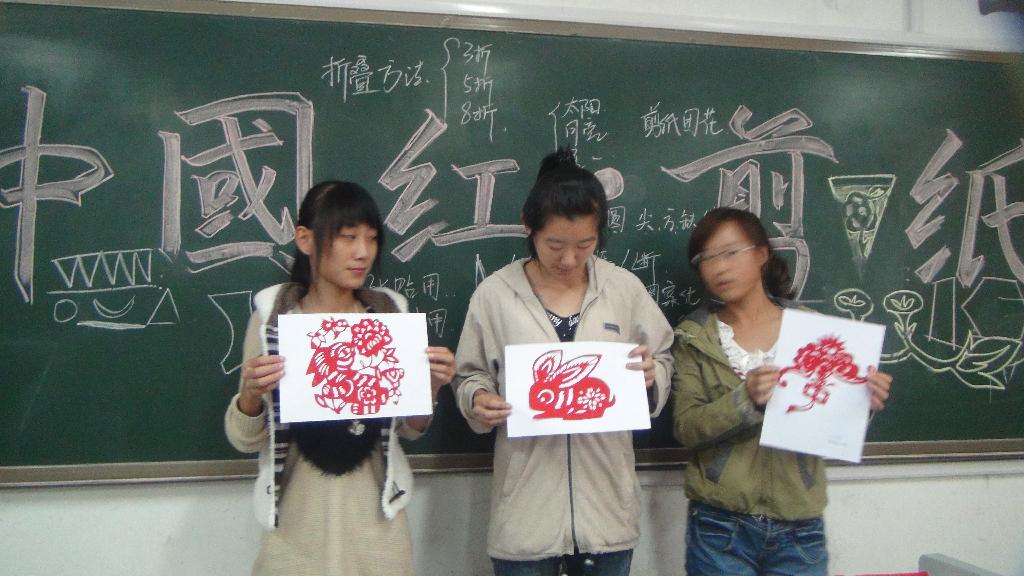 2012年10月23日星期二, 有人文科学系团总支组织学生在2012级语教5班教师开展了了中国红剪纸活动,并邀请了手之韵剪纸社团社员为同学们作了指导。