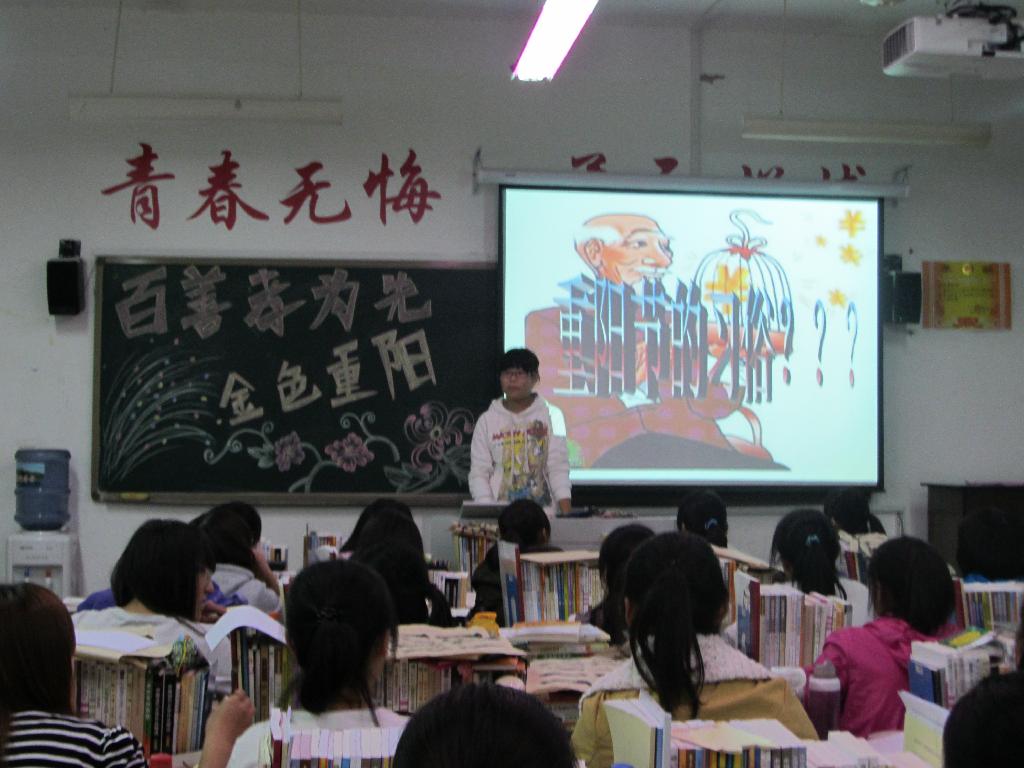本次团课以即将到来的重阳节—敬老节为背景,各班级采取形式多样的团课方式去了解重阳节来历。习俗等。12级5班通过辩论赛形式展示了“老人应不应该送进养老院”的观点及各种社会评论,并针对“老人应不应该送进养老院”中所涉及的敬老、爱老问题组织同学们进行了热烈的辩论。11级3班团支部书记主讲人向同学们讲述了重阳节的来历和地方习俗,同时教育团员青年要将尊老敬老的中华民族传统美德弘扬下去。11级2班的重阳节海报更是博得了满堂喝彩。