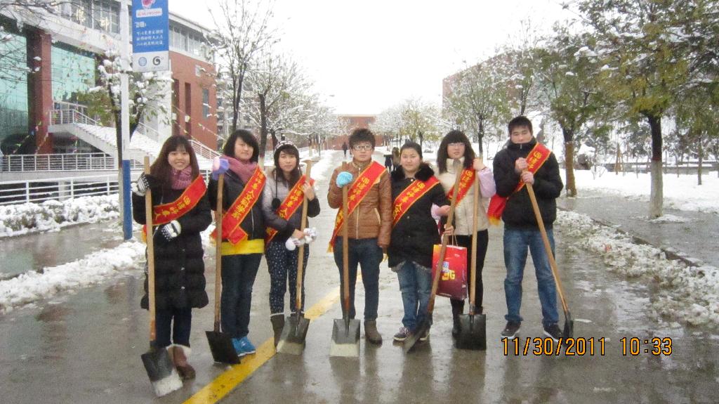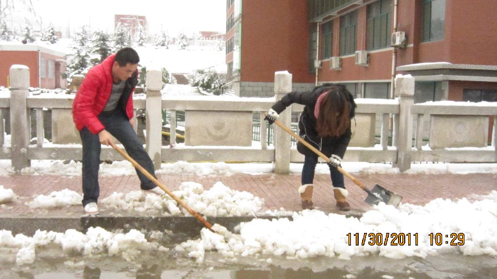 2011年11月30日上午,由人文系自发组织的以“爱心扫雪,共创安全校园”的师生扫雪活动在我校展开。29日晚,淄博入冬以来第一场雪普降大地,皑皑的白雪在带给同学们赏心悦目雪景的同时,也给同学们的出行带来了很大的不便。