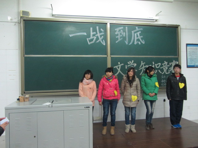2012年12月25日晚7:30在阶梯教室七,由人文系团总支主办,12级语教8班承办的“一战到底”文学知识竞赛(决赛)成功举办。