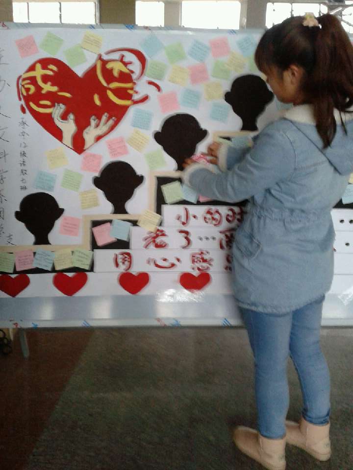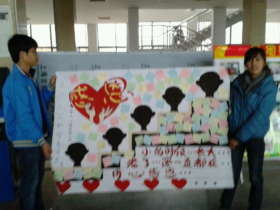 人文系同学们心念感恩,欢度感恩节。为欢度感恩节,向广大学生发放一张张卡片,将同学们对亲人的感恩跃然纸上,并做成一个精美的展板展现在大厅,让更多的同学体会着浓浓的情意。卡片内容不仅包括对父母家人的感恩,而且包括对祖国、对老师、对身边同学的感恩,表现了同学们善于观察,善于体会身边人的关爱。